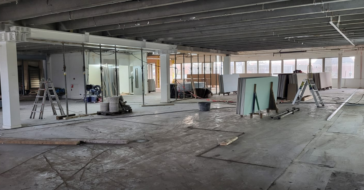 Op de tweede etage zijn inmiddels nieuwe binnenwanden geplaatst en eenzijdig bekleed met gips. Dat betekent dat de installateur hier nu volop aan de slag kan met de technische installaties. Zo wordt het gebouw van binnenuit helemaal veranderd.